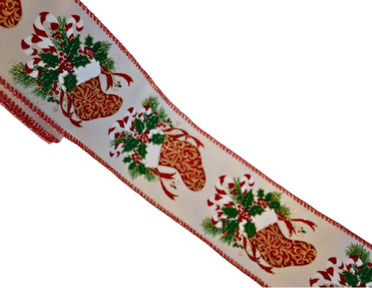 Ruban crème décoré de chaussettes de Noël remplies de branches et bonbons. Largeur 7cm, longueur 9m. Bords métalliques.